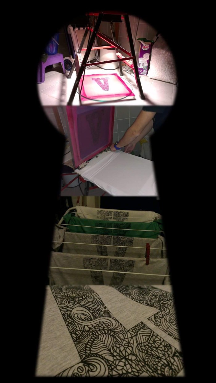 Nach dem Belichten kann der Rahmen in die Siebdruckmaschine eingespannt werden und es können Dinge bedruckt werden. Das Ergebnis sieht man hier: