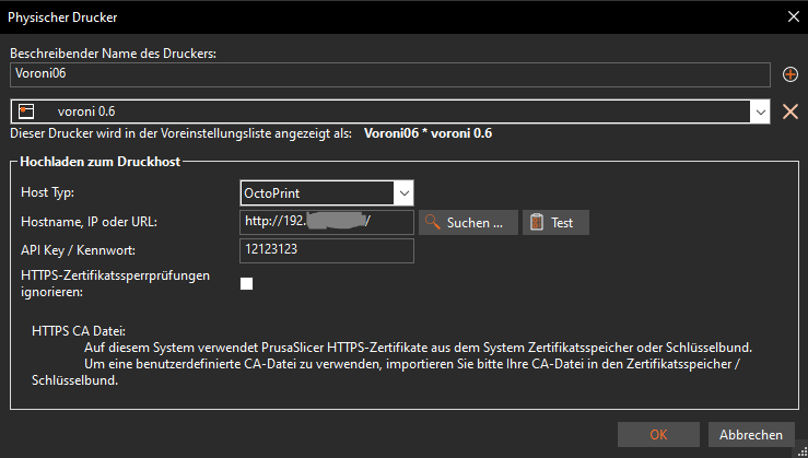 Dazu muss lediglich die IP eingetragen und als Host Typ Octoprint ausgewählt werden.Dann den Drucker als physischen Drucker hinzugefügen.