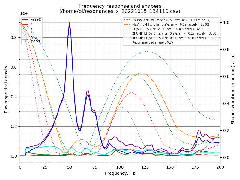 Augrund der unterschiedlichen Massen der Achsen, sehen die Plots auch unterschiedlich aus. Man erkennt eine Resonanz im Bereich von 50 Hz auf der X-Achse und ca. 40 Hz auf der Y-Achse. Es werden verschiedene Inputshaper mit gepunkteten Graphen dargestellt.